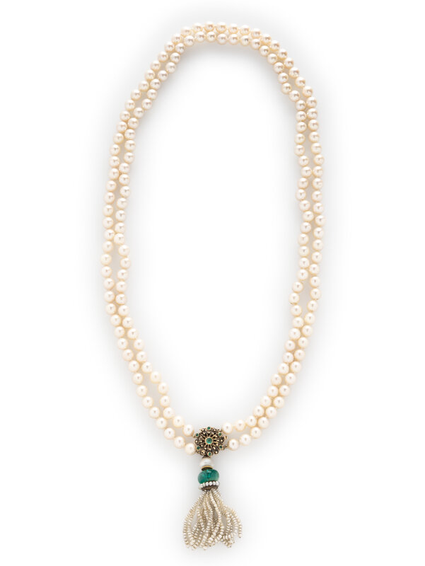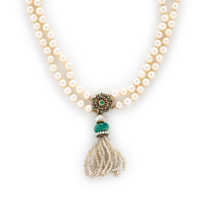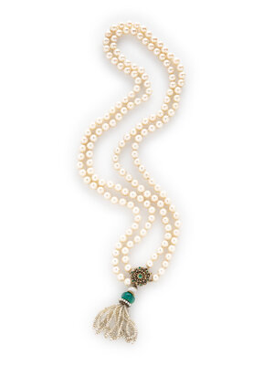 Featuring two strands of round cultured pearls measuring approximately 8.25 - 8.75 mm and finished with a clasp set with round cabochon emeralds, with a detachable pendant set with a baroque cultured pearl measuring 10.95 mm, a carved emerald bead measuring 14.75 mm, and seed pearls. Mounted in 14 karat yellow gold. 29 inches long, with a drop of 2 1/2 inches.