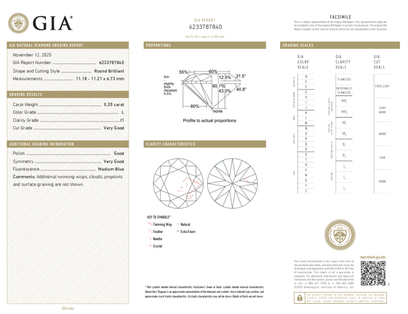 GIA, 2025, Report No. 6233787840, 5.20 carats, L color, I1 clarity, Medium blue fluorescence