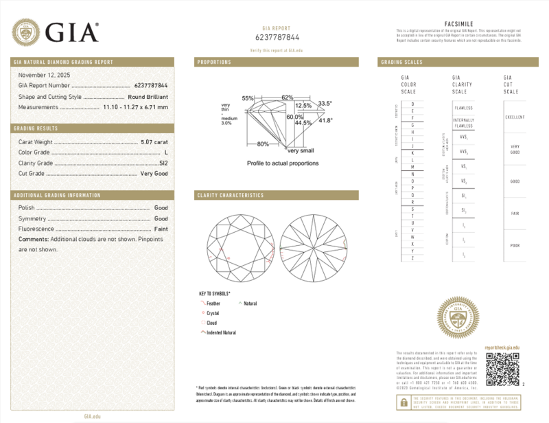 GIA, 2025, Report No. 6237787844, 5.07 carats, L color, SI2 clarity, Faint fluorescence