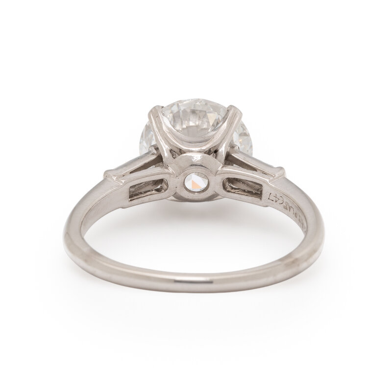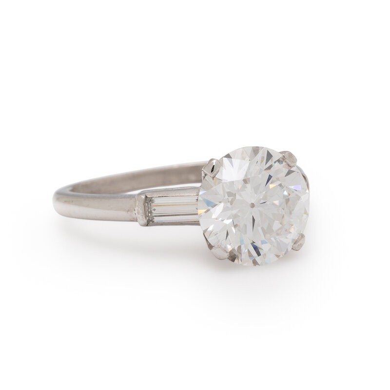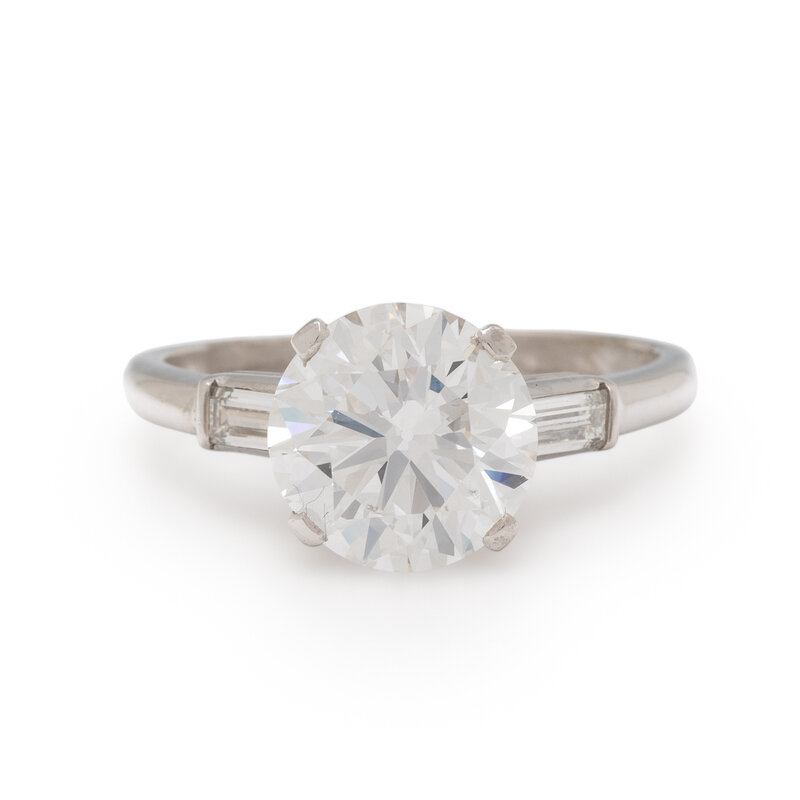 Featuring a round brilliant cut diamond weighing 3.18 carats, flanked by baguette cut diamonds weighing approximately 0.30 carat total. Platinum. Ring size 6 3/4.