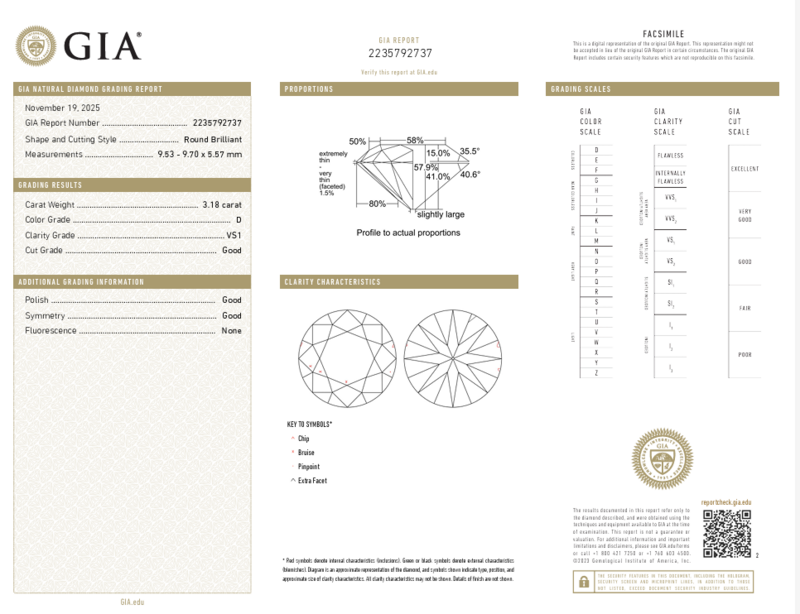 GIA, 2025, Report No. 2235792737, 3.18 carats, D color, VS1 clarity, No fluorescence