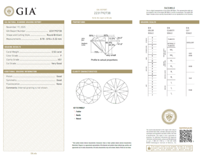 GIA, 2025, Report No. 2231792738, 2.52 carats, F color, VS1 clarity, No fluorescence