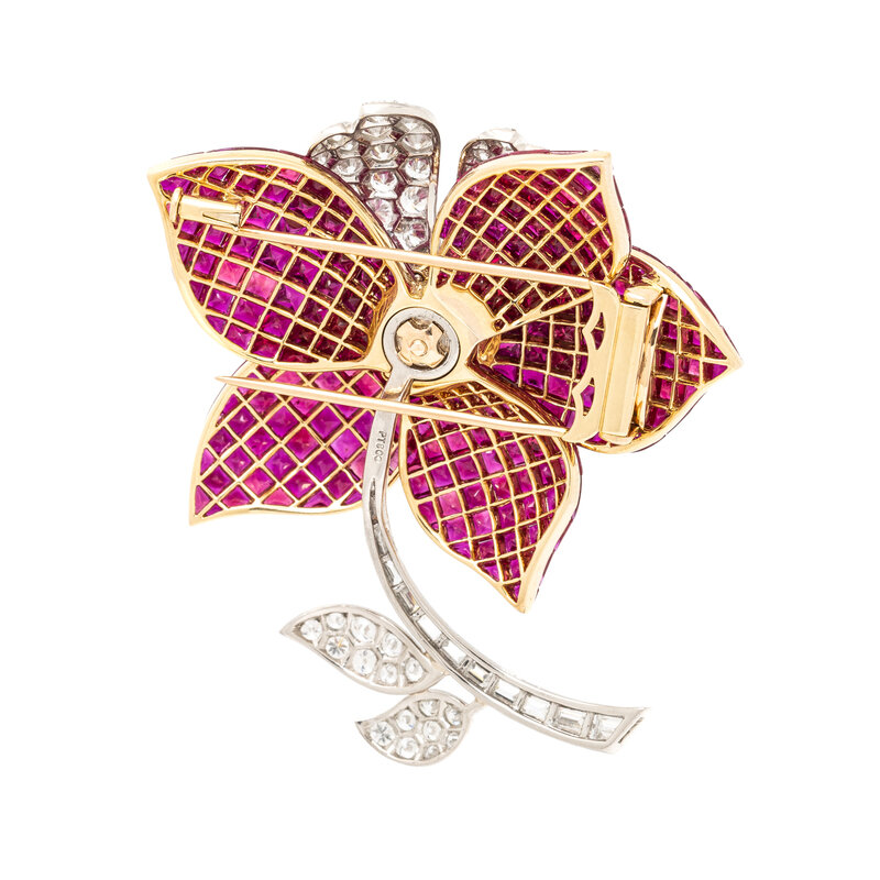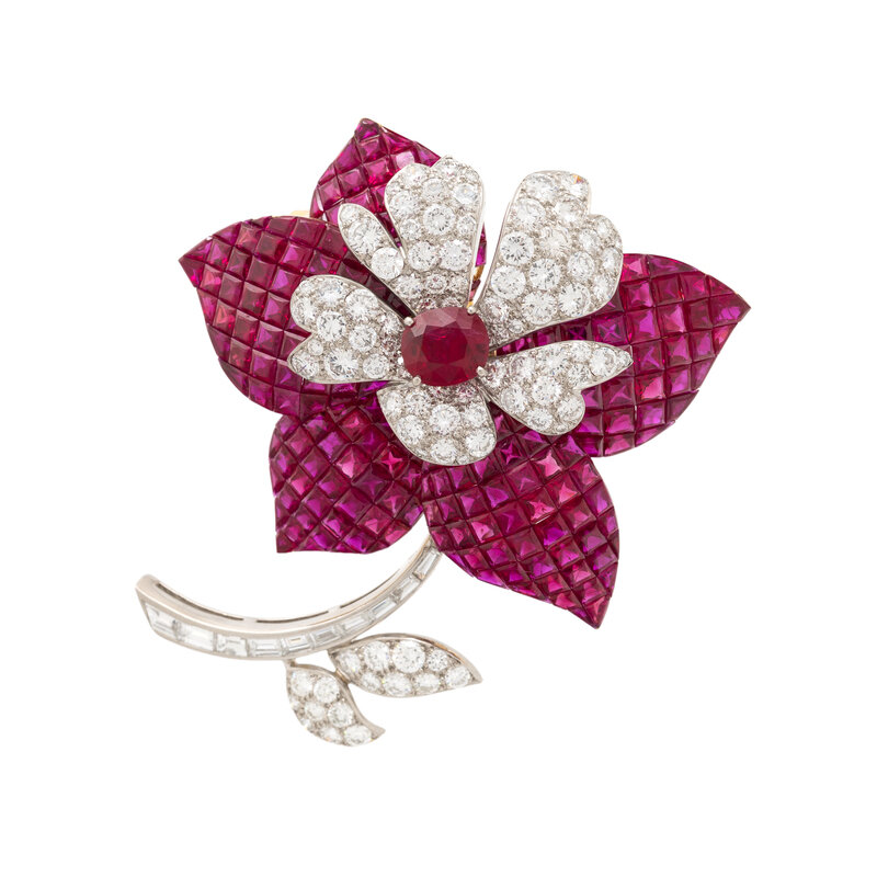 Depicting a flower, the outer petals invisibly-set with calibré cut rubies, the inner petals, leaves, and stem set with round and baguette cut diamonds weighing approximately 5.50 - 6.00 carats total, and the center featuring a cushion cut Burmese ruby weighing approximately 2.50 carats by formula. Mounted in platinum and yellow gold. 2 1/2 x 2 1/8 inches.