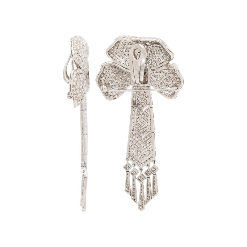 In a geometric bow design, set with round diamonds weighing approximately 13.50 carats total, convertible to brooches. Mounted in 18 karat white gold. 3 1/8 x 2 5/8 inches.