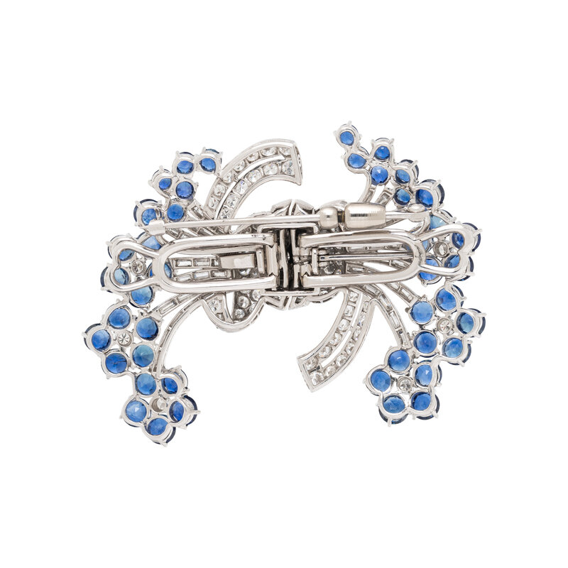 To be worn together as a brooch or separately as dress clips, designed as a bow twist with flowers set with round sapphire petals, and round and baguette cut diamonds throughout weighing approximately 6.75 carats total. Mounted in platinum. 2 1/2 x 1 7/8 inches.