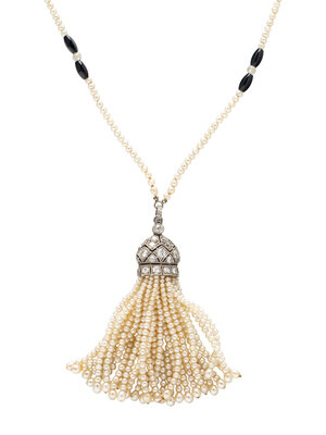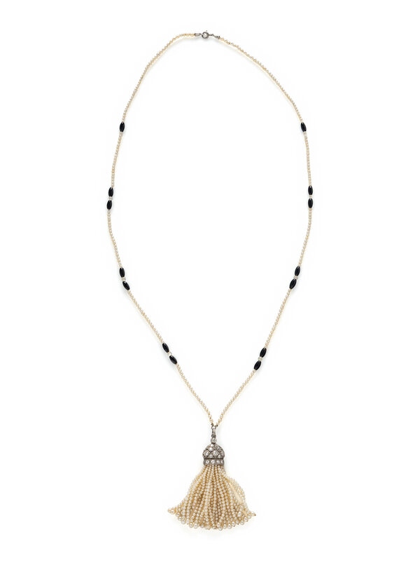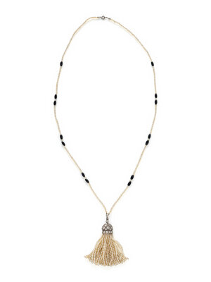 ART DECO, SEED PEARL, DIAMOND, AND ONYX TASSEL NECKLACE