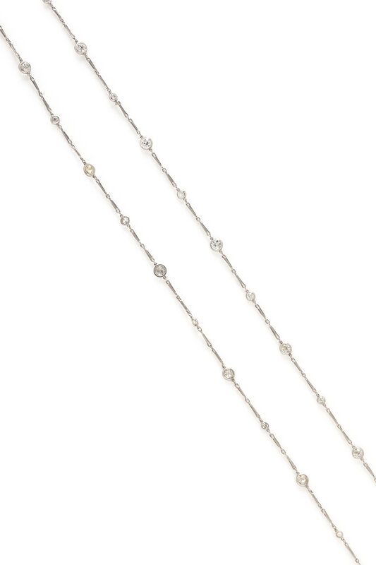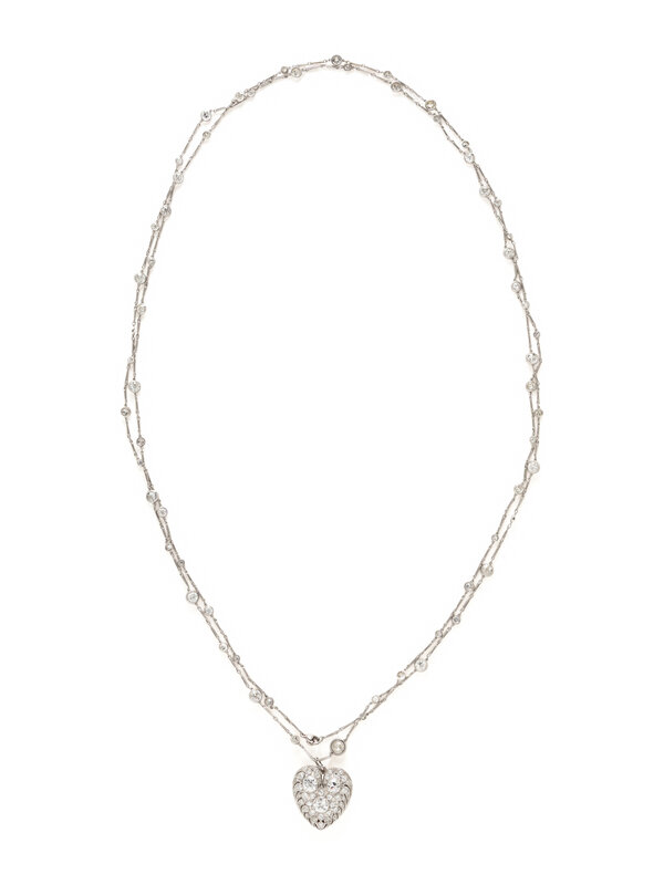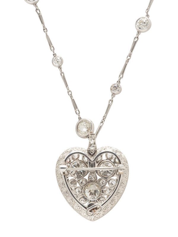 Including a removable heart pendant brooch set throughout with old European cut diamonds weighing approximately 5.00 carats total, on a station chain set with old European cut diamonds weighing approximately 15.50 carats total. Mounted in platinum. Pendant: 1 1/8 x 1 1/8 inches. Chain: 64 inches long.