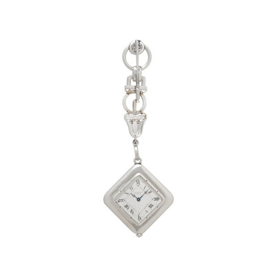 The watch in a square design set at an angle, featuring a silvered dial with Arabic numerals and blued steel hands with the case measuring approximately 28 x 28 mm, the case back featuring a monogram and border set with rose cut diamonds, suspended from a lapel pin set throughout with two transitional cut diamonds weighing approximately 0.35 carat total and numerous additional rose cut diamonds. Mounted in platinum. 3 7/8 inches long.