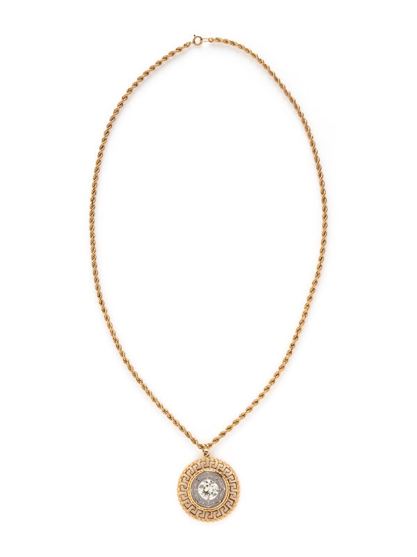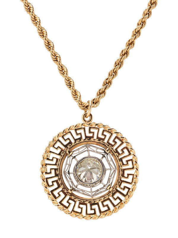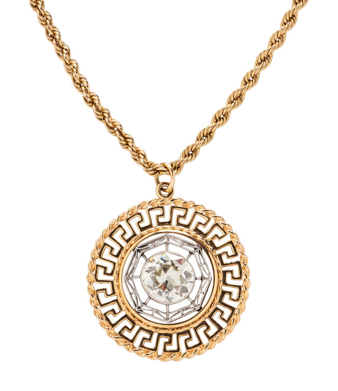 Featuring an old European cut diamond weighing approximately 4.90 - 5.05 carats by formula, in an openwork sun-motif pendant setting on a rope chain. Mounted in 14 karat yellow gold and platinum. Pendant: 1 3/4 inches long. Chain: 24 inches long.