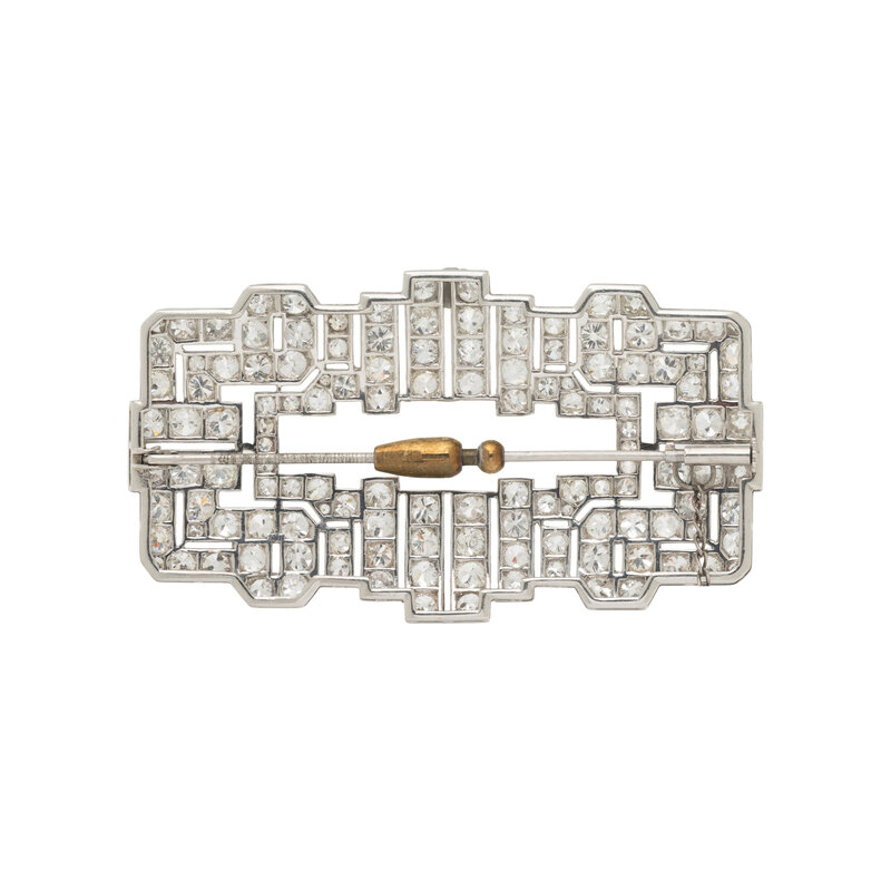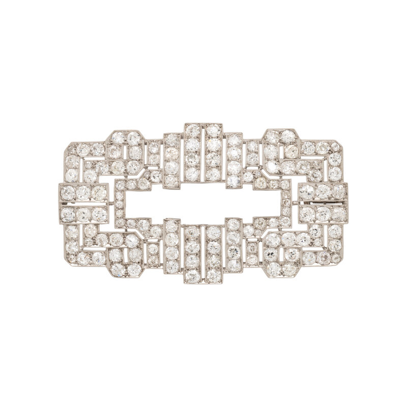 In a geometric design, featuring old European and round diamonds weighing approximately 10.00 carats total. Mounted in platinum. 2 x 1 1/2 inches.