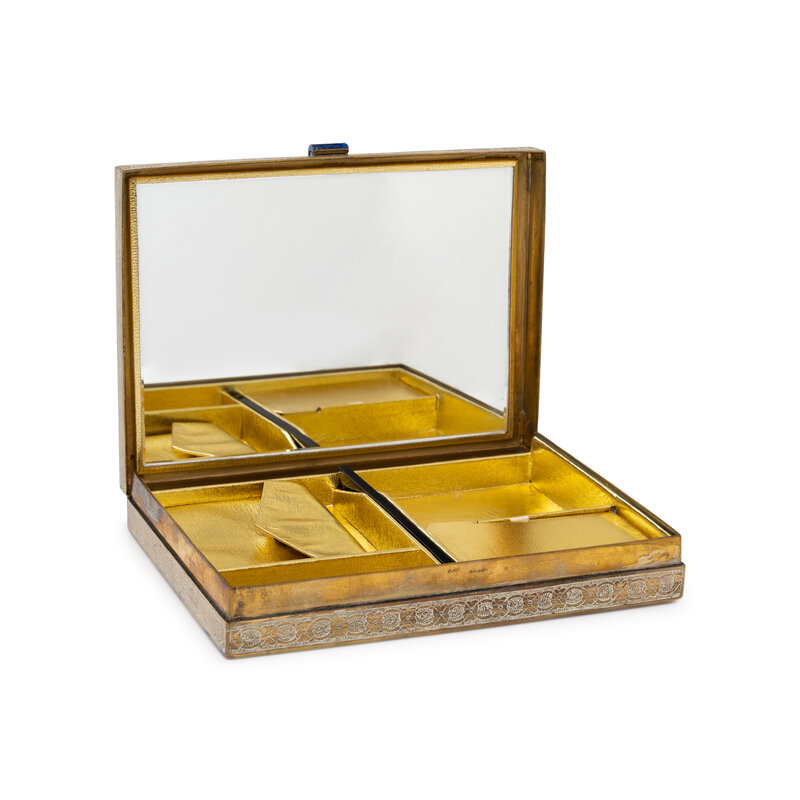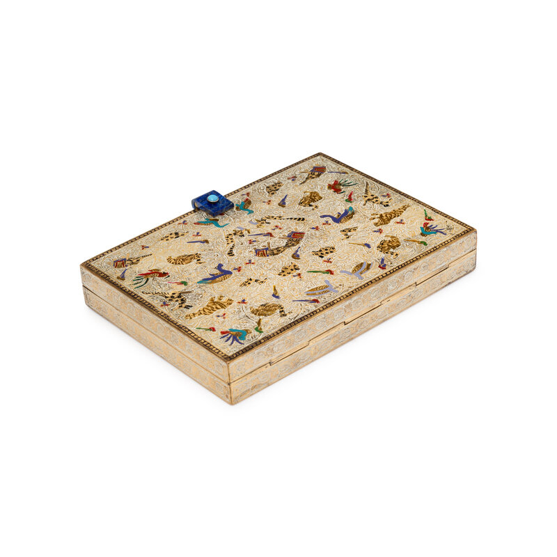The case exterior designed with polychrome champlevé enamel depicting animal and foliate motifs, with a lapis lazuli and round cabochon turquoise thumbpiece, the interior with a mirrored lid and divided compartments, including a Cartier powder puff. Mounted in gilt metal. 6 x 4 3/8 x 7/8 inches.