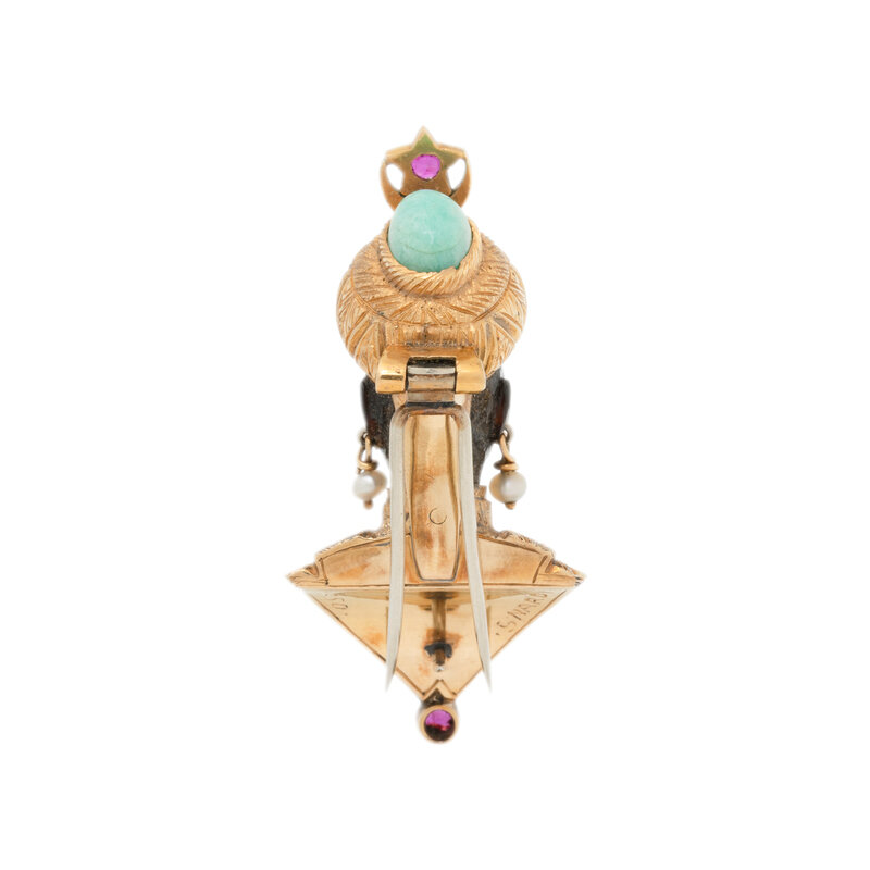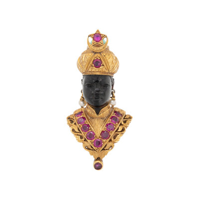 In a figural design, with seed pearl earrings, the crown and royal garments set with round rubies and oval cabochon green hardstone. Mounted in 18 karat yellow gold. 1 7/8 x 7/8 inches.