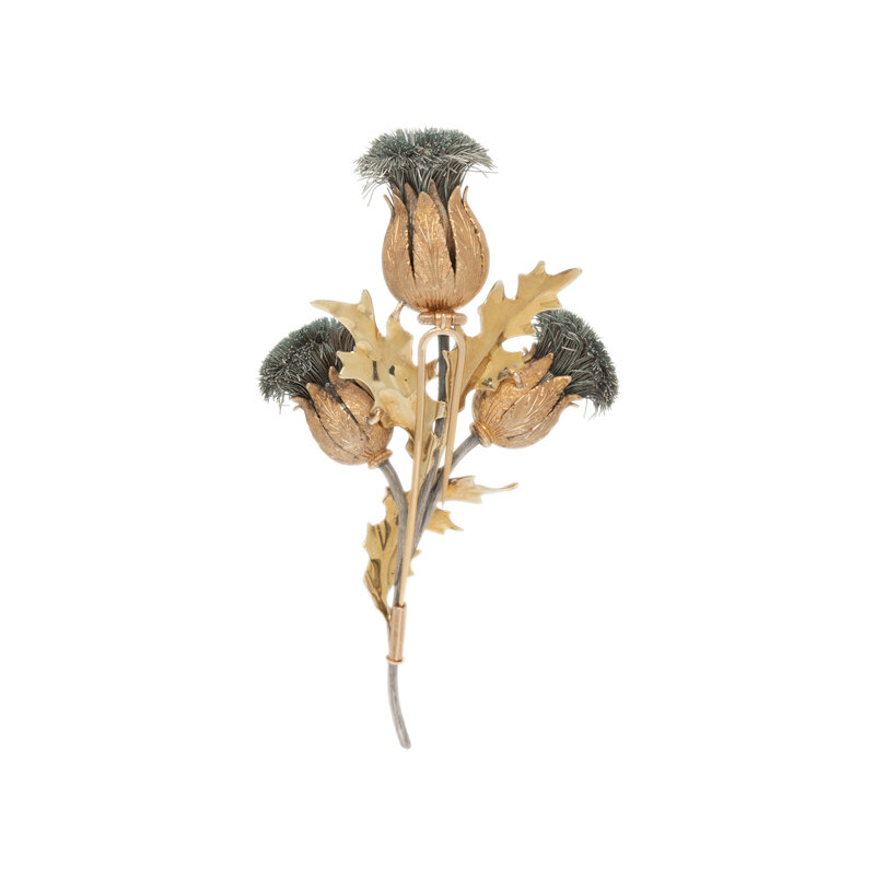 In a thistle flower design, the leaves and bracts in etched 18 karat yellow and rose gold, and the thistle-down and stem in silver. 3 3/4 x 2 1/8 inches.