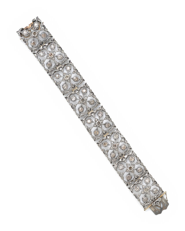Circa 1935, bracelet comprised of square openwork links, set throughout with old European cut brown diamonds (origin of color not tested) weighing approximately 4.75 carats total, with numerous rose cut diamond accents. Mounted in silver-topped yellow gold. 7 1/4 inches long, 1 inch wide.