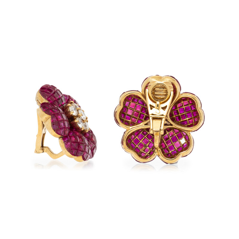 In a flower design, featuring invisibly set calibré cut rubies and round diamonds weighing approximately 1.65 carats total. Mounted in 18 karat yellow gold. 1 inch long.
