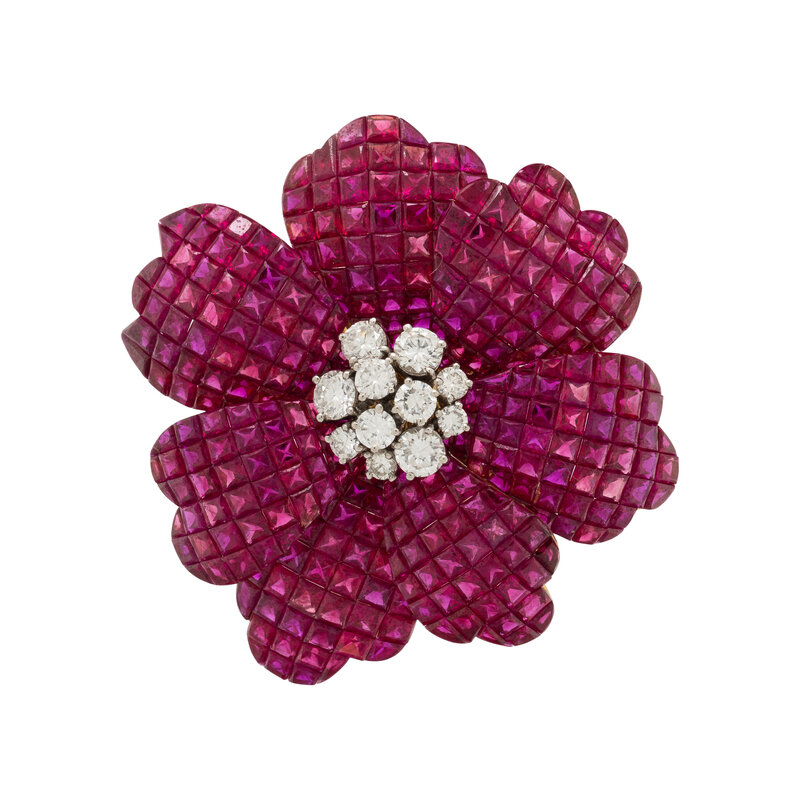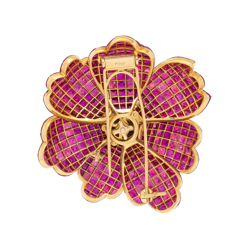 Designed as a flower, the petals invisibly set with rubies, and the center set with a cluster of round diamonds weighing approximately 2.30 carats total. Mounted in yellow gold and platinum. 2 x 2 inches.