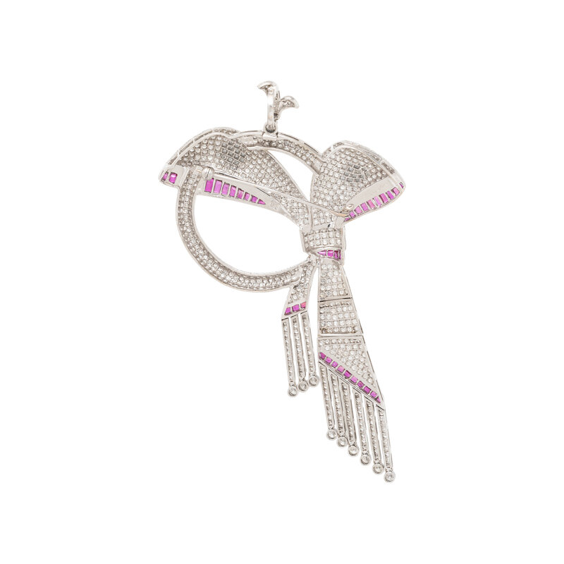 In a fringed geometric bow design, featuring pavé-set round diamonds weighing approximately 7.50 carats total and channel-set calibré and French cut rubies, with a detachable pendant bail. Mounted in 18 karat white gold. 3 1/2 x 2 1/2 inches.