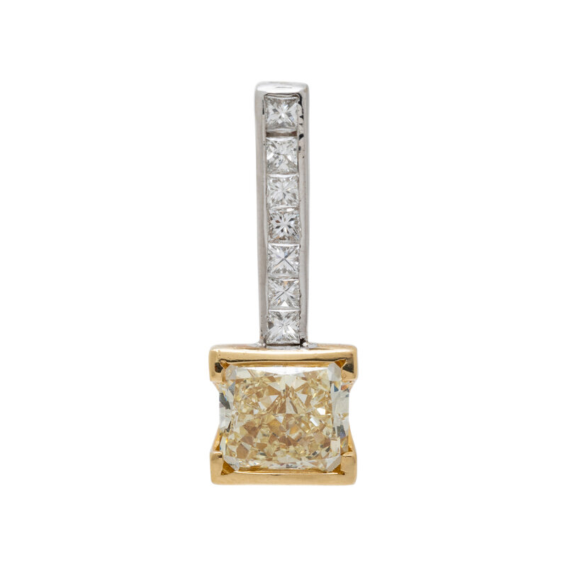 Featuring a radiant cut diamond weighing 4.23 carats, mounted in a bar pendant with seven princess cut diamonds weighing approximately 0.60 carats total. Mounted in 14 karat white and yellow gold. 1 1/8 inches long.