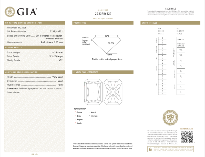 GIA, 2025, Report No. 2233786327, 4.23 carats, W-X color, VS2 clarity, Faint fluorescence