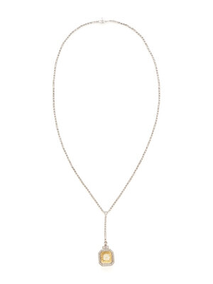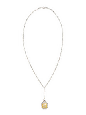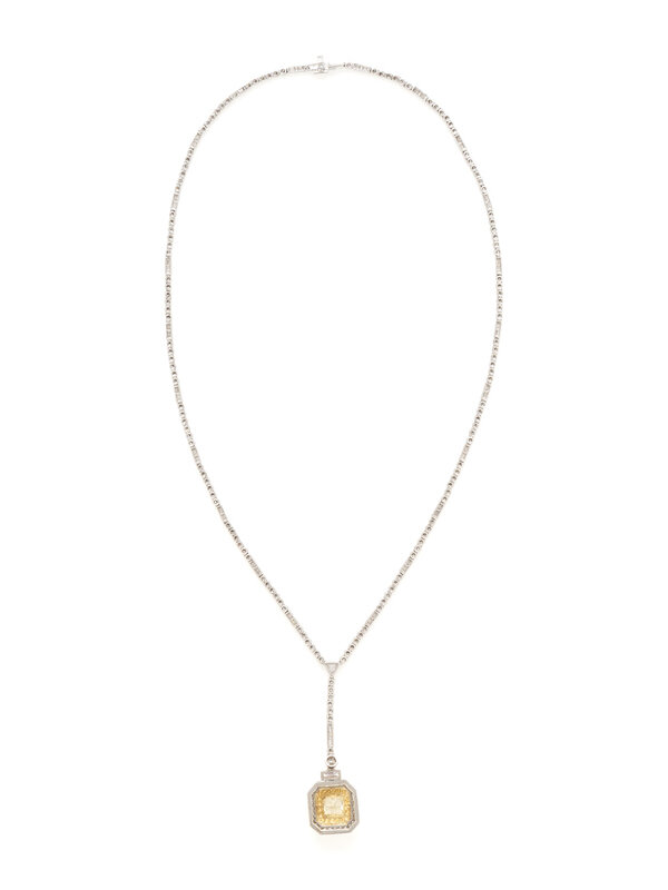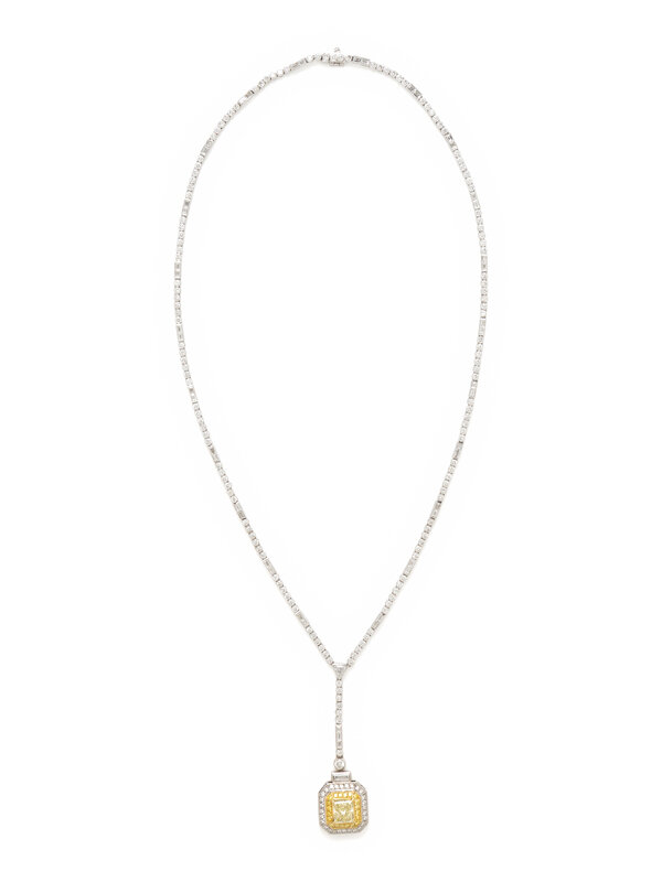 The pendant featuring a radiant cut yellow diamond (origin of color not tested) weighing approximately 1.45 carats by formula, haloed by round yellow diamonds (origin of color not tested) weighing approximately 0.16 carat and round white diamonds weighing approximately 0.23 carat, designed as a lavalier necklace set throughout with round, trillion, and baguette cut diamonds weighing approximately 4.90 carats total. Mounted in platinum. 17 7/8 inches long, with a drop of 2 inches.