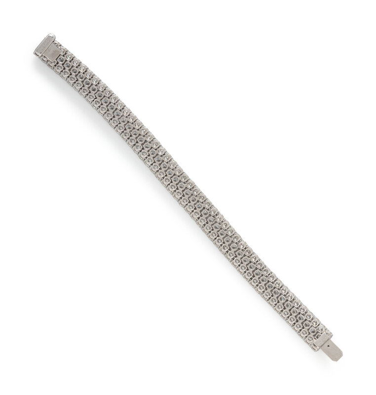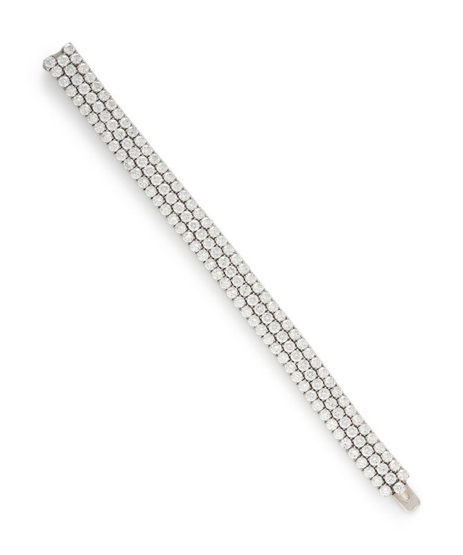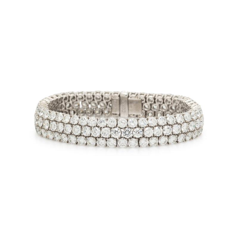 Designed with three rows of round brilliant cut diamonds weighing approximately 28.26 carats total. Mounted in platinum with an 18 karat white gold clasp. 7 1/8 inches long.