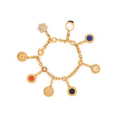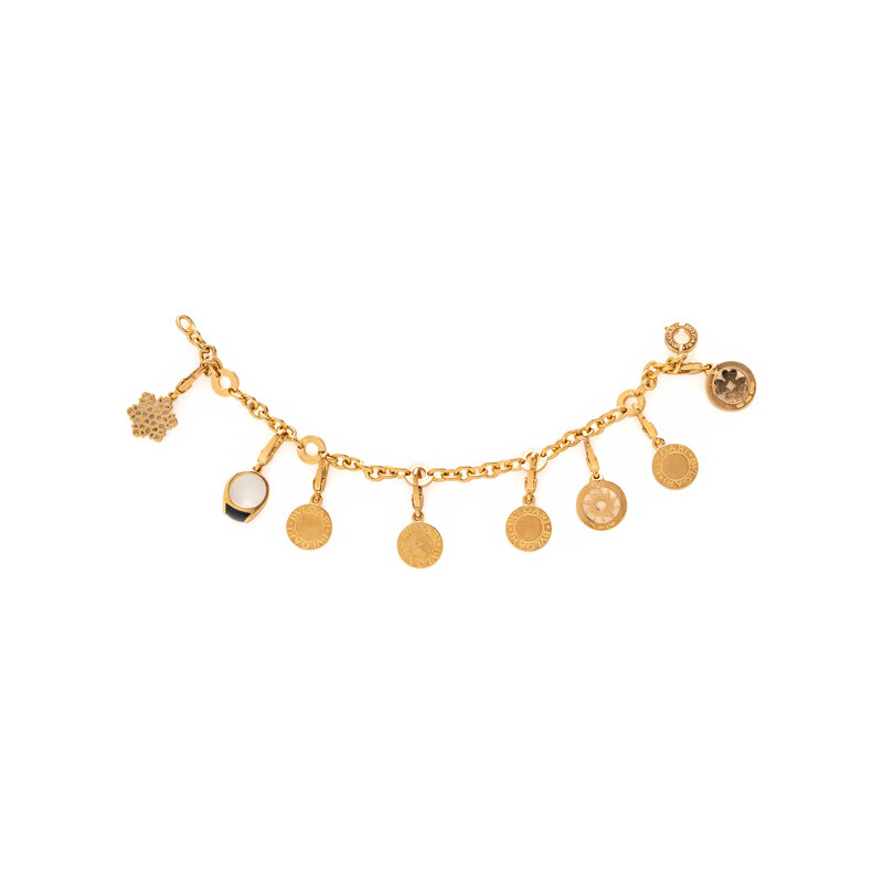 Featuring eight charms on a cable chain bracelet, including a 'Tondo' four-leaf clover charm, a coral 'Bvlgari Bvlgari' charm, a 'Tondo' sun charm, an onyx 'Bvlgari Bvlgari' charm, a 'Bvlgari Bvlgari' charm with pavé-set round diamonds weighing approximately 0.12 carat total, a lapis lazuli 'Bvlgari Bvlgari' charm, an onyx 'Tronchetto' ring charm, and a snowflake with pavé-set round diamonds weighing approximately 0.25 carat total. Mounted in 18 karat yellow gold. Bracelet: 7 1/4 inches long.