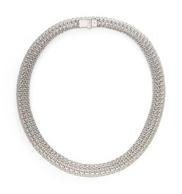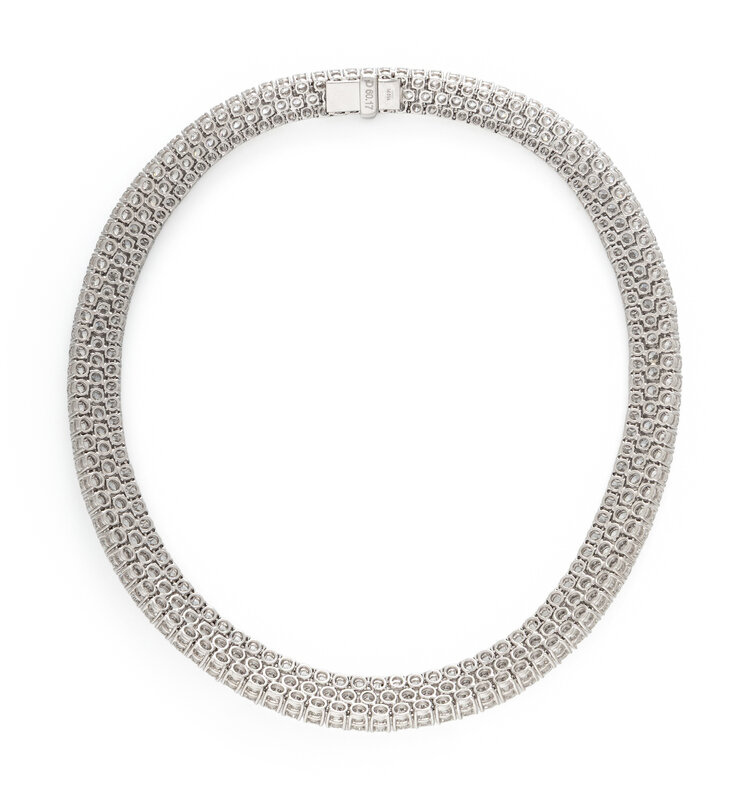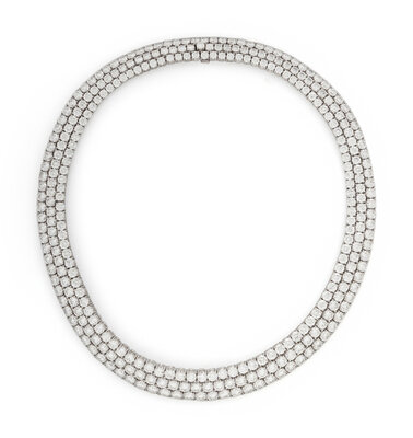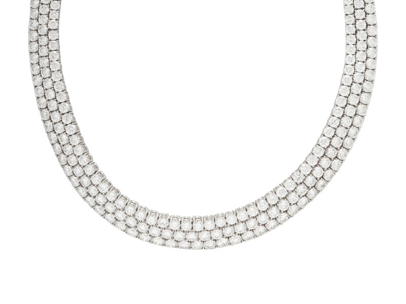Featuring three rows of slightly graduating round brilliant cut diamonds weighing approximately 60.17 carats total. Mounted in platinum with an 18 karat white gold clasp. 15 inches long.