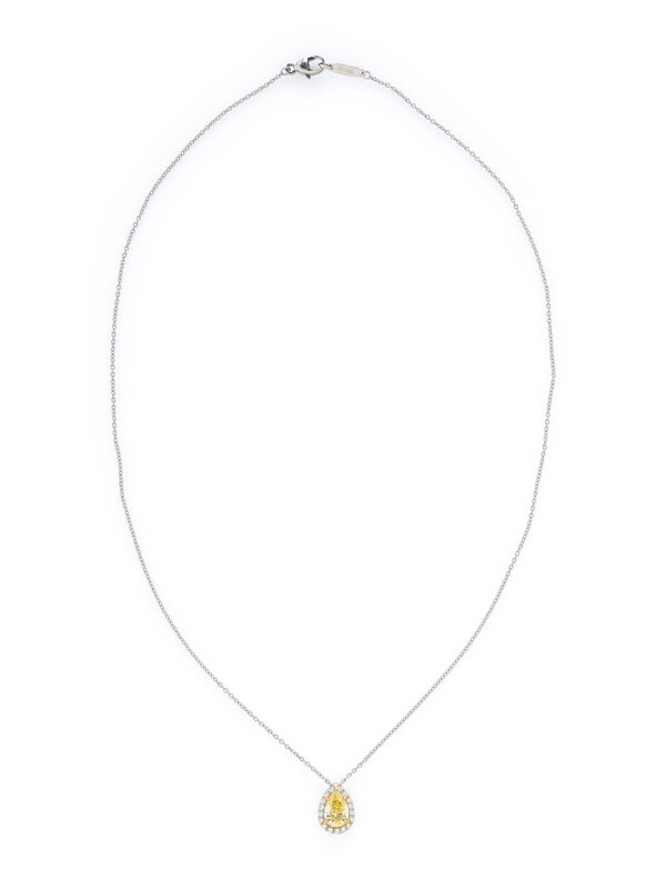 Featuring a pear shape fancy intense yellow diamond weighing 1.00 carat, haloed by round diamonds weighing 0.13 carat, on an integrated cable chain. Mounted in platinum with 18 karat yellow gold. Chain: 15 3/4 inches long.