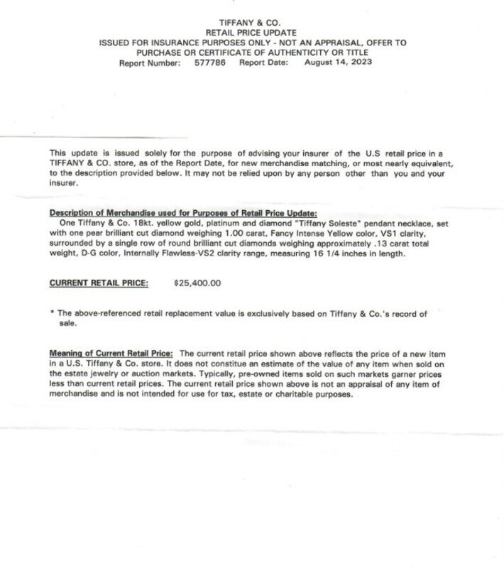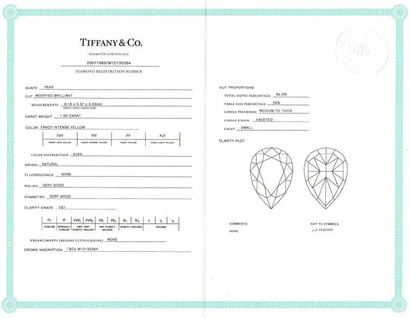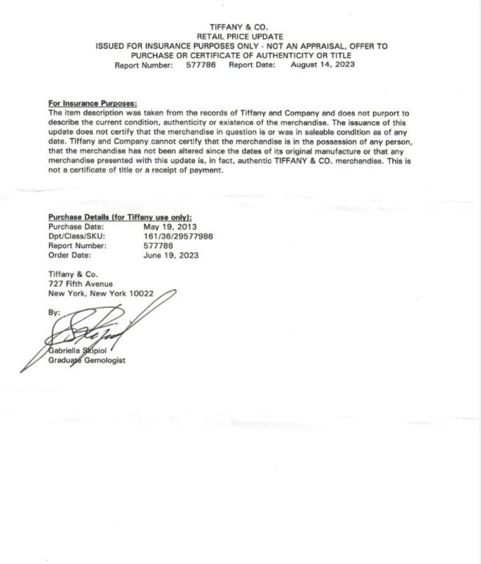 Accompanied by a Tiffany & Co. Diamond Grading Certificate and a Retail Price Update letter.