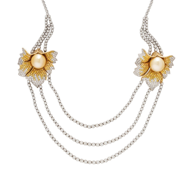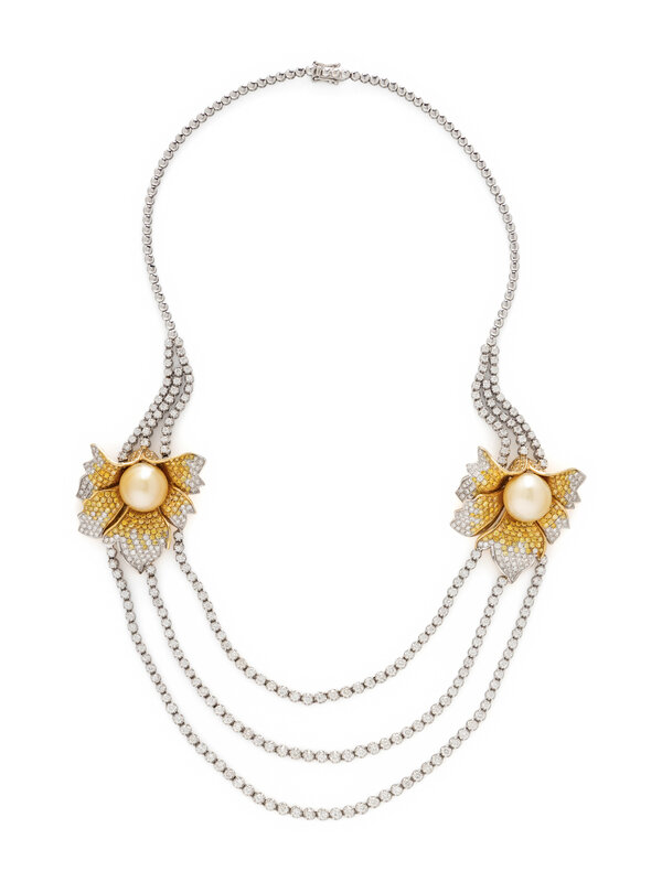 In a swag design punctuated by two flower motifs, set with golden cultured pearls (origin of color not tested) measuring approximately 13.00 mm, round yellow diamonds (origin of color not tested) weighing approximately 4.17 carats total, and round diamonds weighing approximately 10.564 carats total. Mounted in 18 karat white gold. 18 inches long.