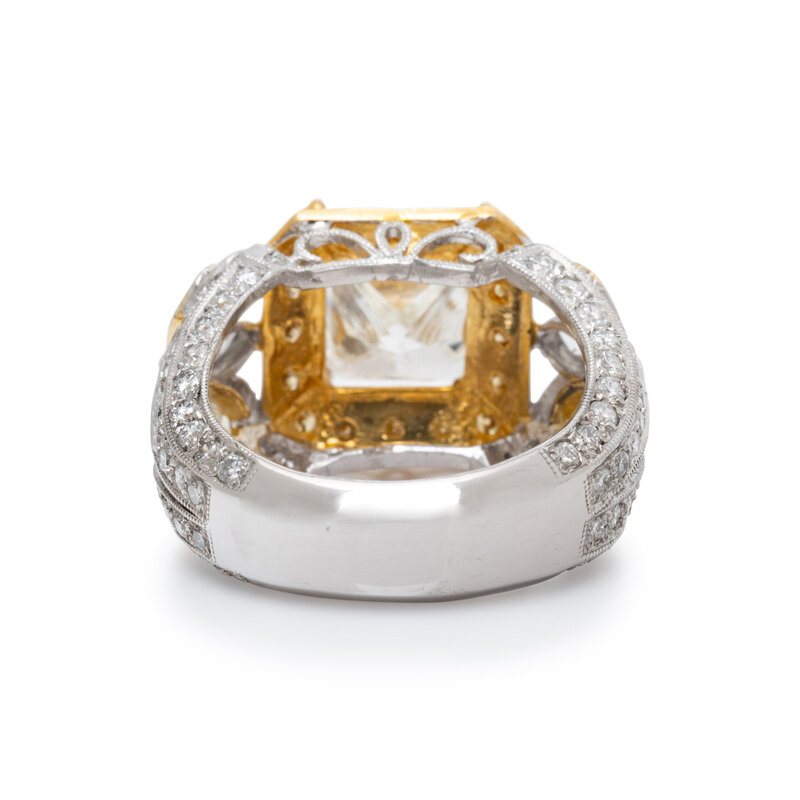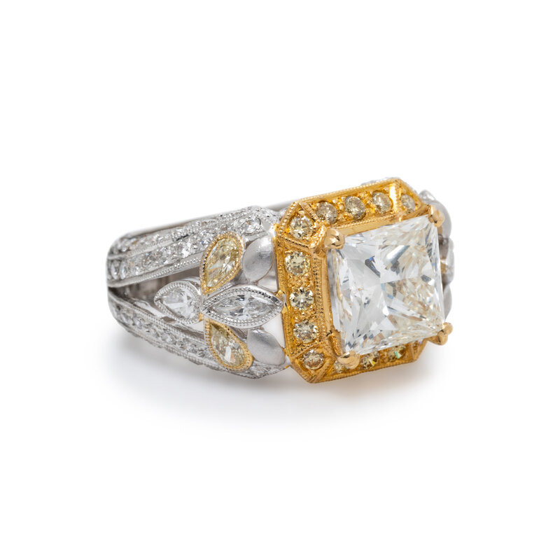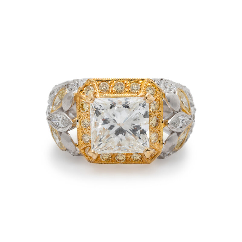 Featuring a princess cut diamond weighing 5.01 carats, accented by round, marquise cut, and pear shape diamonds weighing approximately 1.60 carats total, and round and pear shape yellow diamonds (origin of color not tested) weighing approximately 0.70 carat total. Mounted in platinum and 18 karat yellow gold. Ring size 8 1/4.