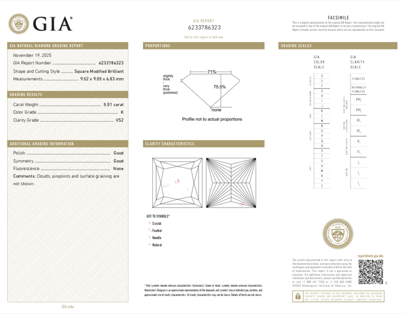 GIA, 2025, Report No. 6233786323, 5.01 carats, K color, VS2 clarity, No fluorescence