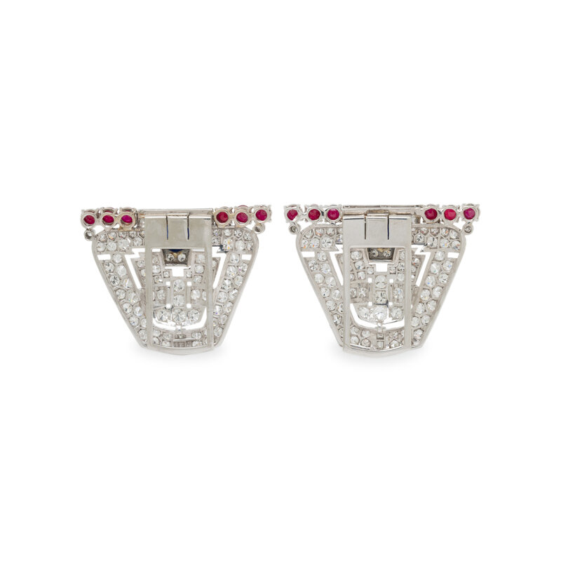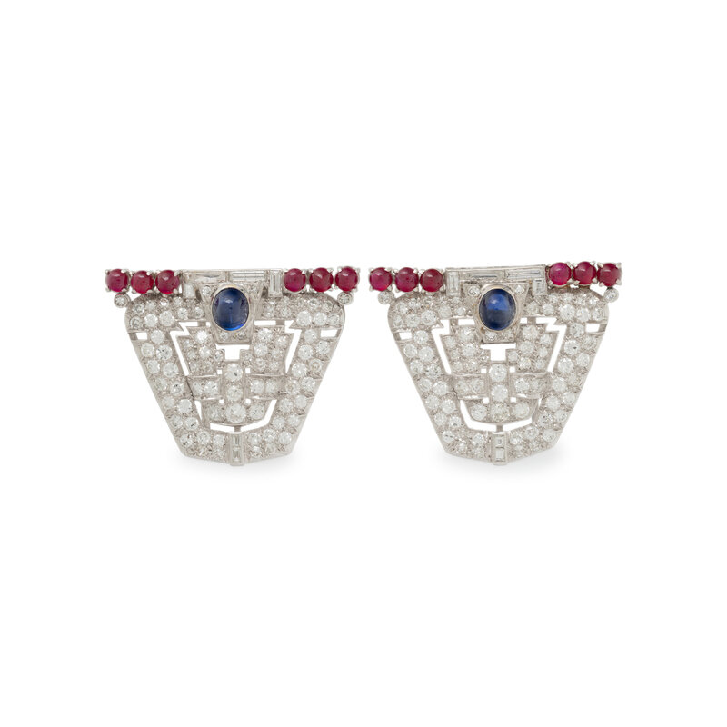 PAIR OF DIAMOND, SAPPHIRE, RUBY, AND WHITE GOLD DRESS CLIPS