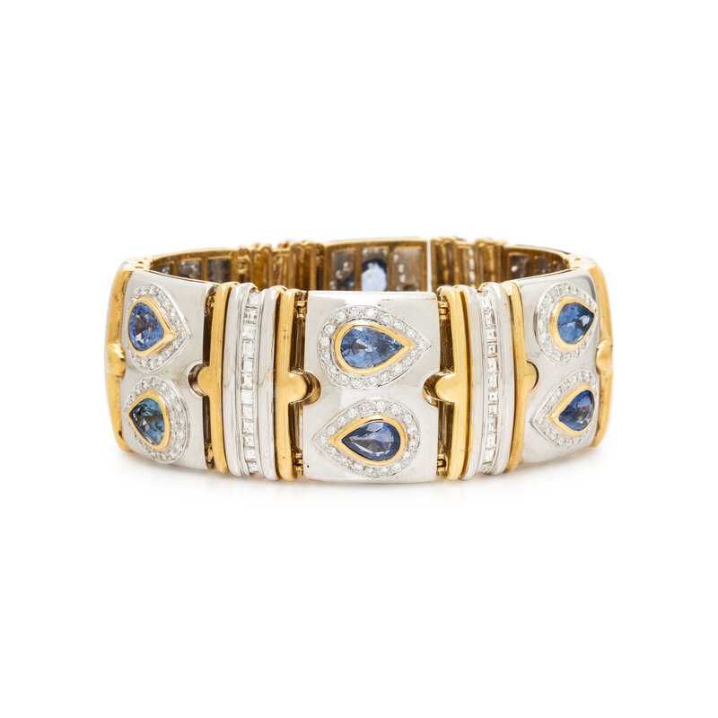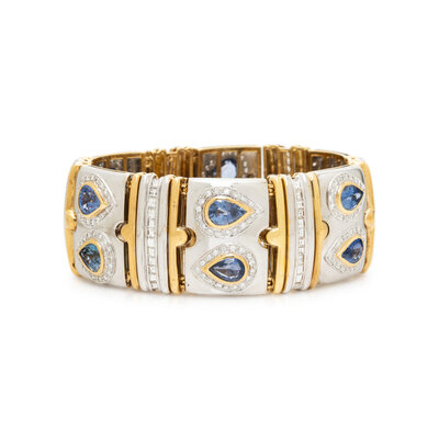 In juxtaposed links of yellow and white gold, set with 12 pear shape sapphires weighing approximately 18.00 - 20.00 carats total by formula, and round and square step cut diamonds weighing approximately 5.70 carats total. Mounted in yellow and white gold. 7 3/8 inches long, 1 inch wide.