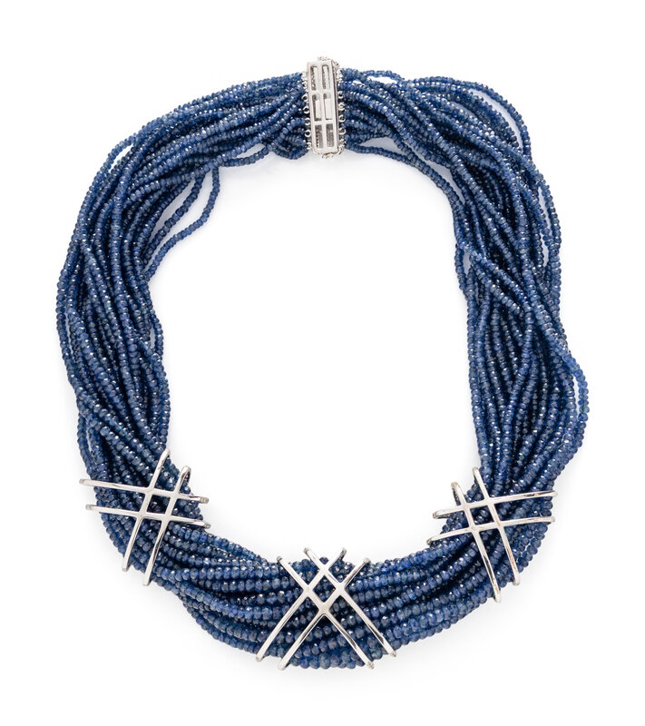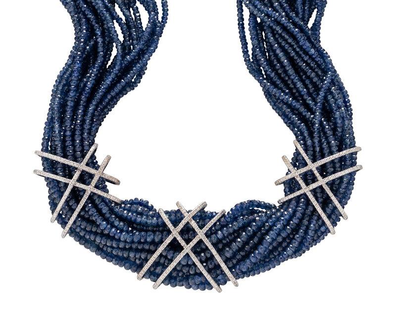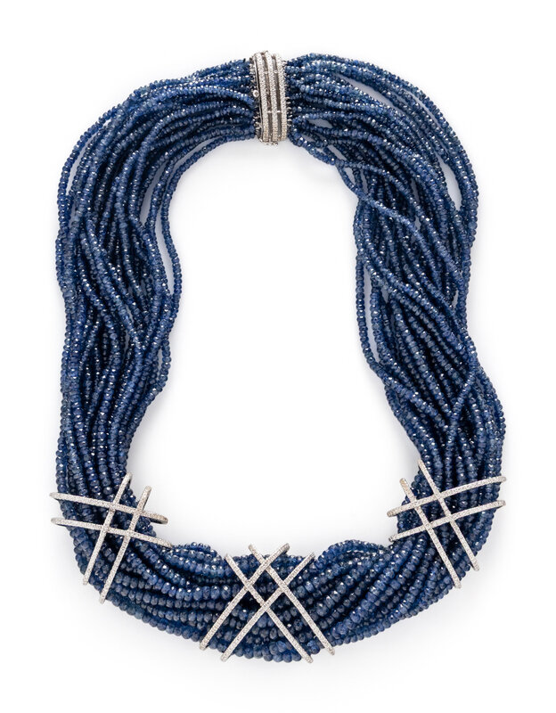 Designed with numerous strands of faceted sapphire beads, gathered by three white gold double 'X' motifs set throughout with round diamonds weighing approximately 4.90 carats total. 18 karat white gold. 18 inches long.