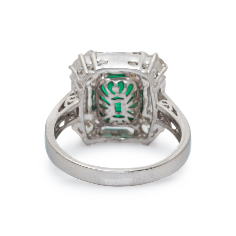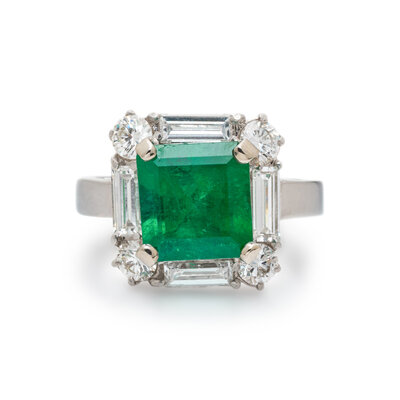 Featuring a square step cut emerald weighing approximately 4.10 carats by formula, framed by four round diamonds and four baguette cut diamonds weighing approximately 1.65 carats total. Mounted in 18 karat white gold. Ring size 8 1/2.