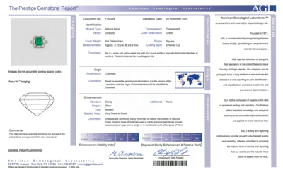 AGL, 2025, Report No. 1152254, Natural Beryl, Emerald, Colombia, Minor Modern Clarity enhancement