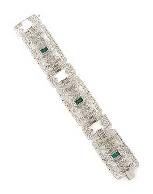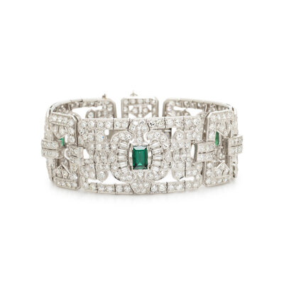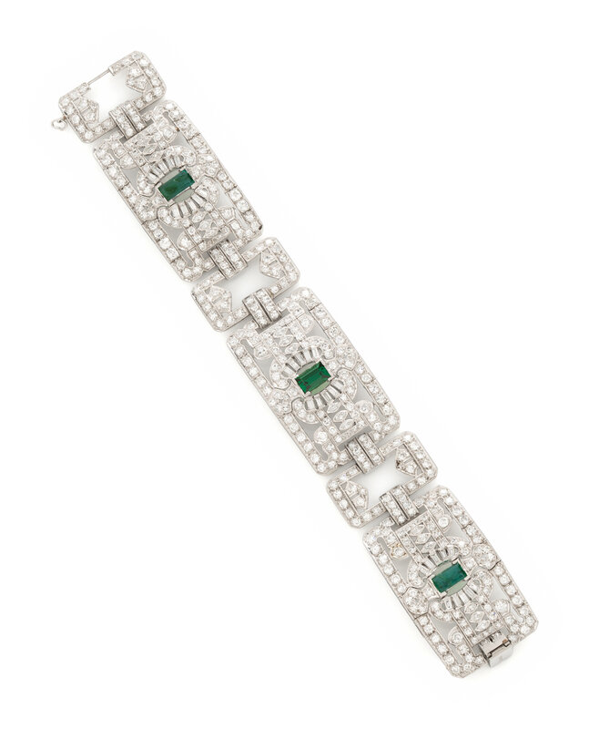 Designed with three plaques joined by geometric links, set throughout with single, marquise, and baguette cut diamonds weighing approximately 17.00 carats total, with two of the plaques set with emerald cut emeralds weighing approximately 1.50 carats total, and one plaque set with an emerald cut synthetic emerald. Mounted in platinum. 7 1/4 inches long, 1 inch wide.
