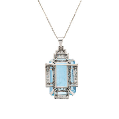 The brooch pendant set with an emerald cut aquamarine weighing approximately 53.00 carats by formula, with single cut diamonds accenting the surround and retractable bail weighing approximately 0.95 carat total, on a chain with a round and single cut diamond-accented clasp. Mounted in platinum. Chain: 17 1/2 inches long. Pendant: 1 3/4 inches long.