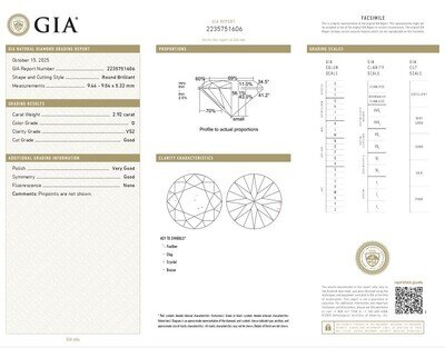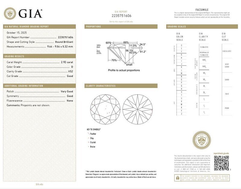 GIA, 2025, Report No. 2235751606, 2.92 carats, D color, VS2 clarity, No fluorescence