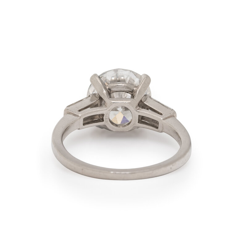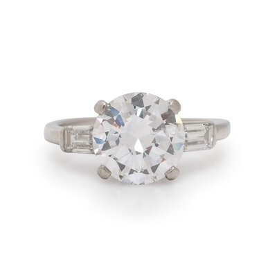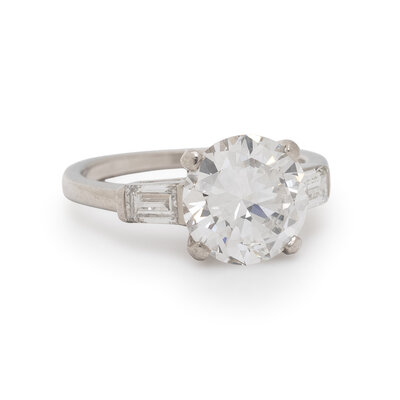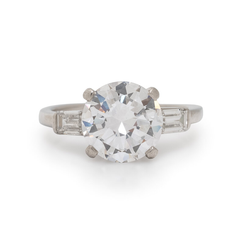 Featuring a round brilliant cut diamond weighing 2.92 carats, flanked by baguette cut diamonds. Mounted in platinum. Ring size 6.