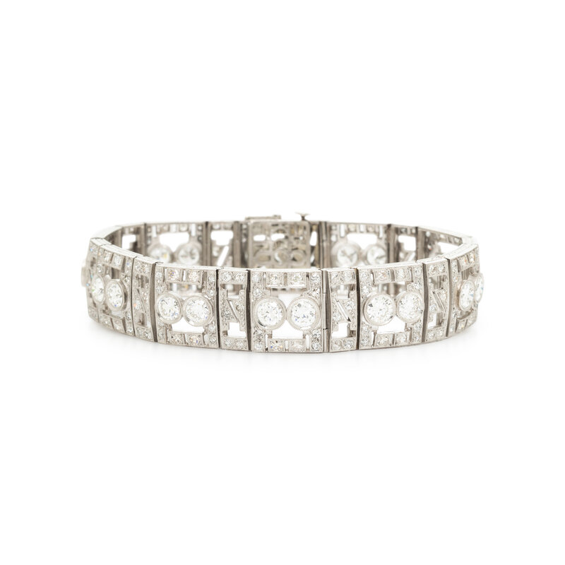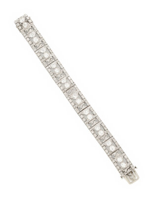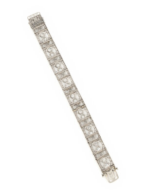 Set with transitional and single cut diamonds weighing approximately 9.00 carats total. Mounted in platinum. 6 1/2 inches long, 1/2 inch wide.