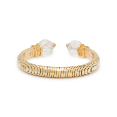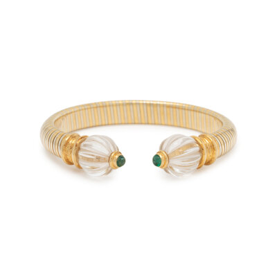 The cuff designed in alternating stripes of yellow and white gold, completed by carved rock crystal quartz and round cabochon emerald finials. Mounted in 18 karat yellow and white gold. 6 1/4 inches inner circumference.