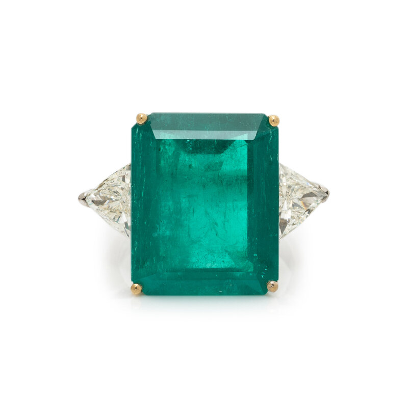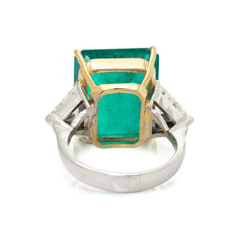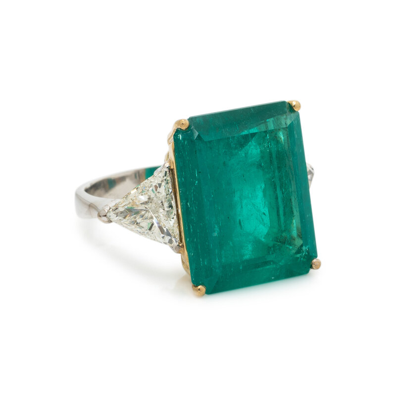 Featuring an emerald cut Colombian emerald weighing approximately 16.10 carats by formula, flanked by trillion cut diamonds weighing approximately 2.00 carats total. Mounted in 18 karat yellow and white gold. Ring size 8 1/2.