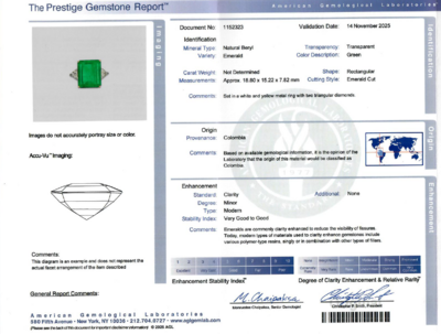 AGL, 2025, Report No. 1152323, Natural Beryl, Emerald, Colombia, Minor Modern Clarity Enhancement