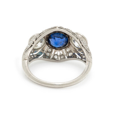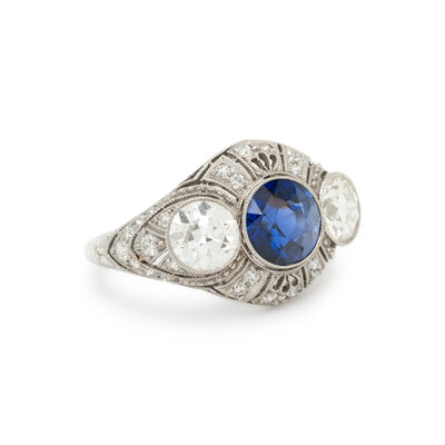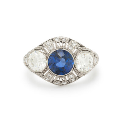 Featuring a round sapphire weighing approximately 1.65 carats by formula flanked by two round diamonds weighing approximately 1.20 carats total, the filigree setting with single and old European cut diamonds weighing approximately 0.30 carats total. Mounted in platinum. Ring size 7.