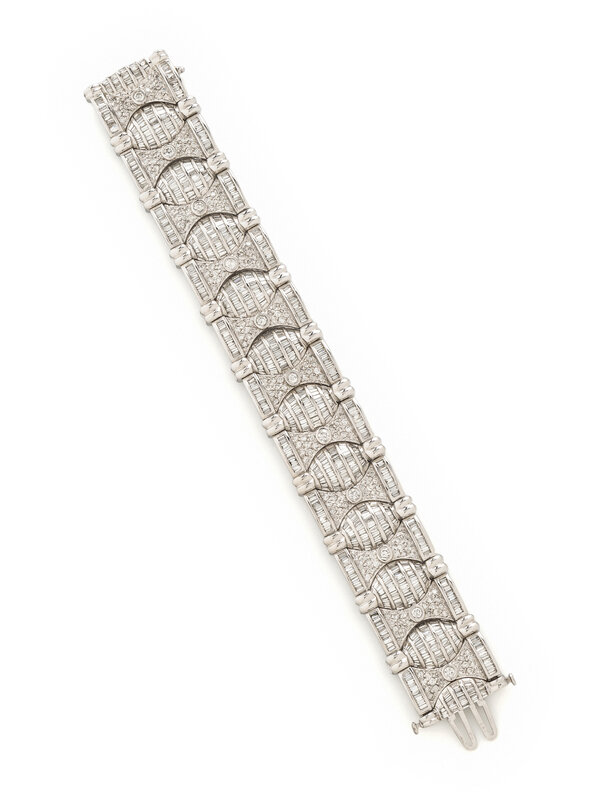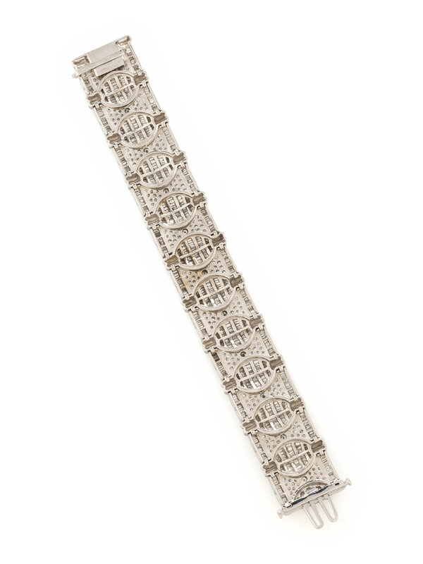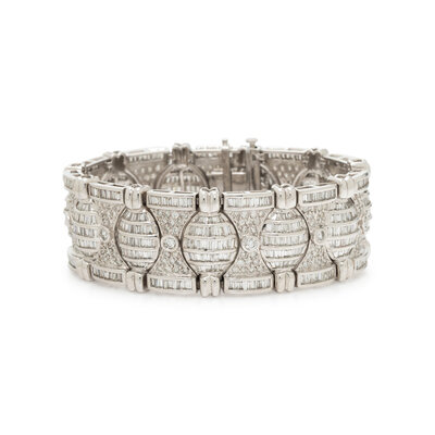 In a geometric design, with fancy links set throughout with numerous round and baguette cut diamonds weighing approximately 18.00 carats total. Mounted in 18 karat white gold. 7 1/4 inches long, 1 inch wide.