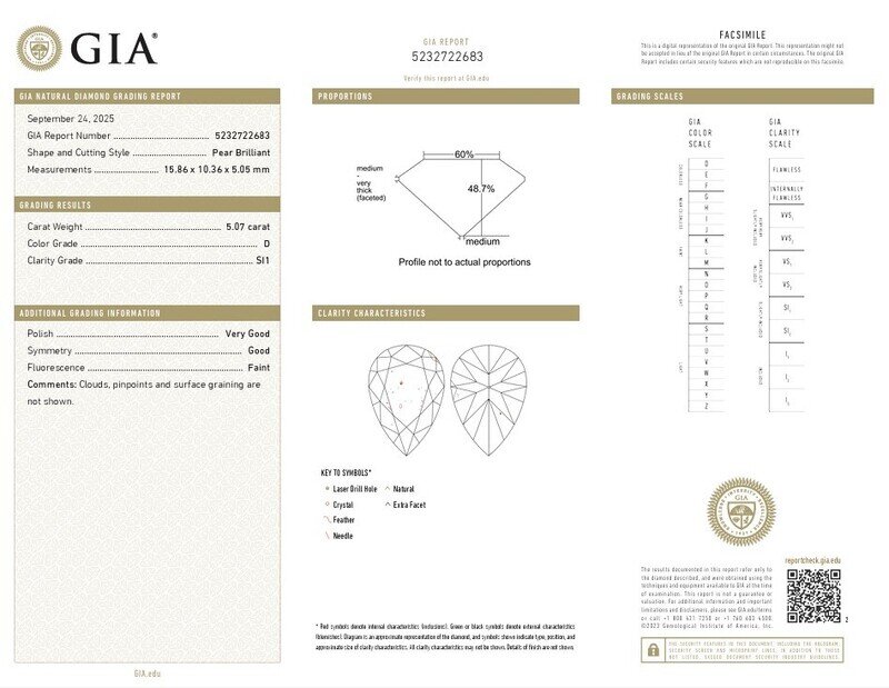 GIA, 2025, Report No. 5232722683, 5.07 Carat, D Color, SI1 Clarity, Faint Fluorescence