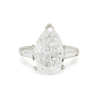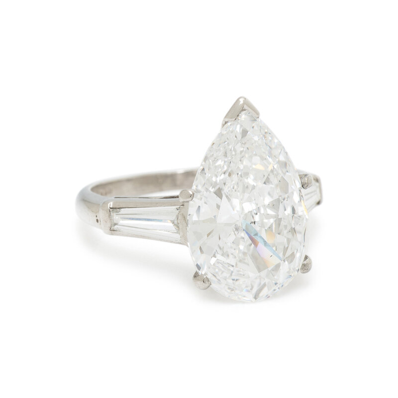 Featuring a pear shaped diamond weighing 5.07 carats, flanked by two tapered baguette cut diamonds weighing approximately 0.50 carat total. Mounted in platinum. Ring size 6 1/4.