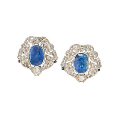 Featuring oval sapphires weighing approximately 17.00 carats total by formula, with numerous transitional cut diamonds set throughout weighing approximately 2.50 carats total, and square step cut sapphire accents. Mounted in 14 karat white gold. 1 x 1 1/8 inches.